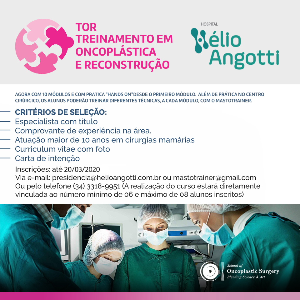 Foram prorrogadas, até o dia 20 de março, as inscrições para o TOR – Treinamento em Oncoplástica e Reconstrução, que será oferecido pelo Hospital Hélio Angotti a cirurgiões com mais de 10 anos de experiência em cirurgias mamárias (além de outros requisitos). O treinamento será liderado pelo médico ginecologista e mastologista, coordenador da Residência Médica em Mastologia do HHA, Cléber Sérgio da Silva, em parceria com o médico ribeirão-pretano, Gustavo Zucca Matthes, formado pela Universidade Federal do Triângulo Mineiro (UFTM), professor e atualmente co-diretor da “School of Oncoplastic Surgery” (EUA). O curso, totalmente reformulado, terá duração de 10 meses (10 módulos) e prática “hands on” desde o primeiro módulo. E além da prática no centro cirúrgico, os alunos poderão treinar técnicas diferentes com o Mastotrainer. . Inscrições e informações, pelos e-mails: presidencia@helioangotti.com.br ou mastrotrainer@gmail.com e também pelo telefone (34)3318-9951. (A realização do curso estará diretamente vinculada ao mínimo de seis (06) e ao máximo de oito (08) inscritos).