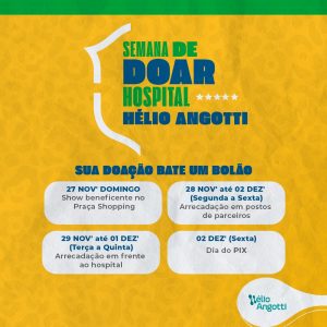 O Hospital Hélio Angotti, que é filantrópico e atende pacientes com câncer de Uberaba e outras 59 cidades mineiras, irá participar pelo segundo ano consecutivo. E resolveu ampliar a campanha, criando a SEMANA DE DOAR. A programação será aberta no dia 27 de novembro, no Praça Uberaba Shopping, com um show beneficente. “Será um evento para a família, com música do Projeto ao Cubo e outros artistas convidados, bingo e muita diversão, aliada à solidariedade. A entrada será um quilo de alimento não-perecível por pessoa”, explicou a representante da Rede de Proteção Social, setor do hospital realizador da semana, Aline Amaral.